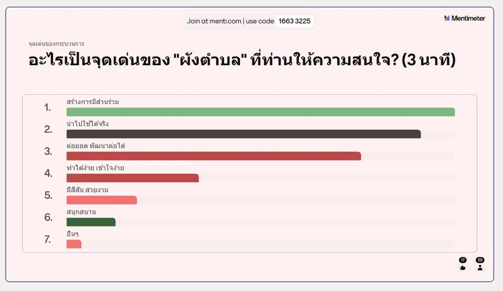 ในช่วงเวทีแลกเปลี่ยนความคิดเห็น ผู้แทนจากพื้นที่ขยายผลได้ร่วมกันสะท้อนมุมมองต่อการใช้ “ผังตำบล” ในการแก้ไขปัญหาช้างป่า พร้อมกำหนดเป้าหมายการทำงานร่วมกันในระดับภูมิภาค โดยมี นายบัญชา เทียมครบุรี และ นายวิษณุพงศ์ โนจิตต์ นักจัดการข้อมูลจากบางกอกซิตี้แลป ทำหน้าที่สรุปสาระสำคัญ พบว่า