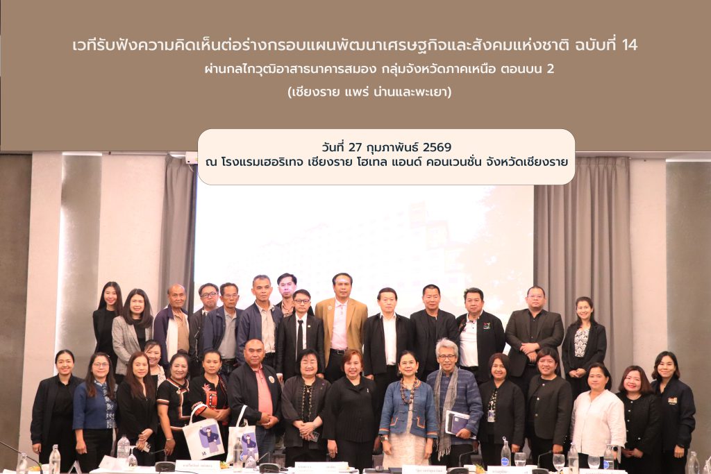 วันที่ 27 กุมภาพันธ์ 2569 มูลนิธิพัฒนาไทร่วมกับสำนักงานสภาพัฒนาการเศรษฐกิจและสังคมแห่งชาติ จัดเวทีเปิดรับฟังความคิดเห็นต่อร่างกรอบแผนพัฒนาเศรษฐกิจและสังคมแห่งชาติ ฉบับที่ 14 ผ่านกลไกวุฒิอาสาธนาคารสมอง กลุ่มจังหวัดภาคเหนือตอนบน 2 (เชียงราย แพร่ น่านและพะเยา) ณ โรงแรมเฮอริเทจ เชียงราย โฮเทล แอนด์ คอนเวนชั่น จังหวัดเชียงราย มีวุฒิอาสาฯ และเครือข่ายการทำงานที่มีประสบการณ์และความเชี่ยวชาญที่หลากหลายเข้าร่วม จำนวน 21 คน โดยมีนางสาววรวรรณ พลิคามิน รองเลขาธิการสภาพัฒนาการเศรษฐกิจและสังคมแห่งชาติและเลขาธิการมูลนิธิพัฒนาไท กล่าวต้อนรับและชี้แจงวัตถุประสงค์ และ ดร.ปฏิมา จงเจริญธนาวัฒน์ ผู้อำนวยการกองศึกษาและวิจัยเชิงยุทธศาสตร์ นำเสนอผลการขับเคลื่อนแผนพัฒนาเศรษฐกิจและสังคมแห่งชาติ ฉบับที่ 13 สถานการณ์และความท้าทายต่อการพัฒนาประเทศ และภาพรวมของร่างกรอบแผนพัฒนาฯ ฉบับที่ 14 ซึ่งเป็นเวที ที่เปิดกว้างให้ให้ทุกคนได้มีโอกาสแสดงความคิดเห็นร่วมกัน ในทุกประเด็นของ 5 เสาหลักการพัฒนา